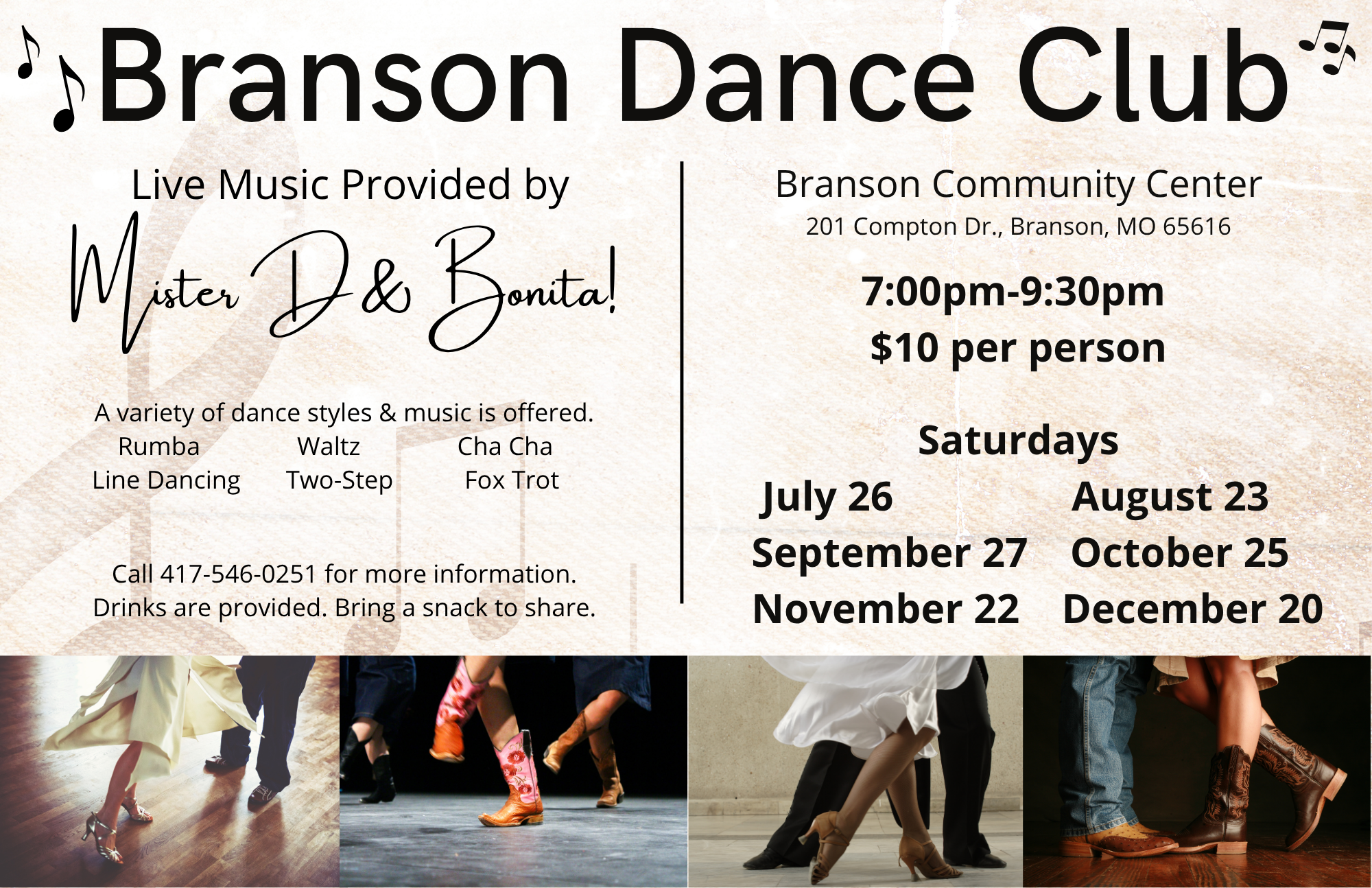 Drop into our monthly Dance held on Saturday once a month from 7:00-9:30pm at the Branson Community Center. Click here for dates and more information.